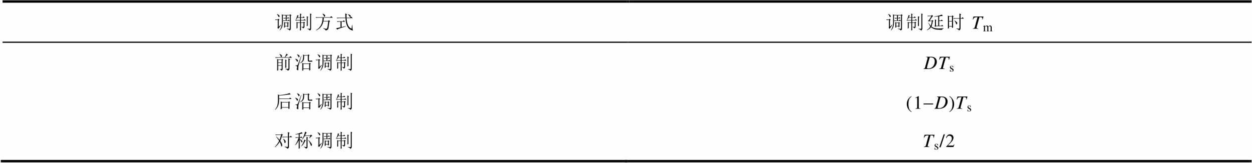 对于数字PWM,其导致的环路中的控制延时主要包括数字信号微处理器带来的计算延时和数字调制器的采样特性带来的调制延时,调制延时的时间取决于数字PWM的调制形式,具体见表2,其中,Ts为开关管的开关周期。因此,控制延时构成的传递函数可表示为