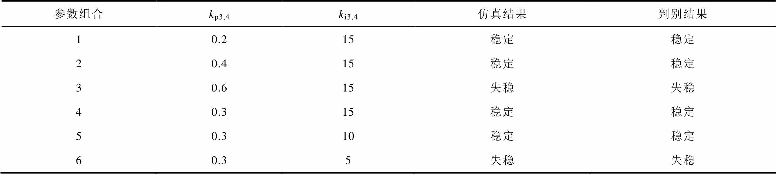 参数组合kp3,4ki3,4仿真结果判别结果 10.215稳定稳定 20.415稳定稳定 30.615失稳失稳 40.315稳定稳定 50.310稳定稳定 60.35失稳失稳
