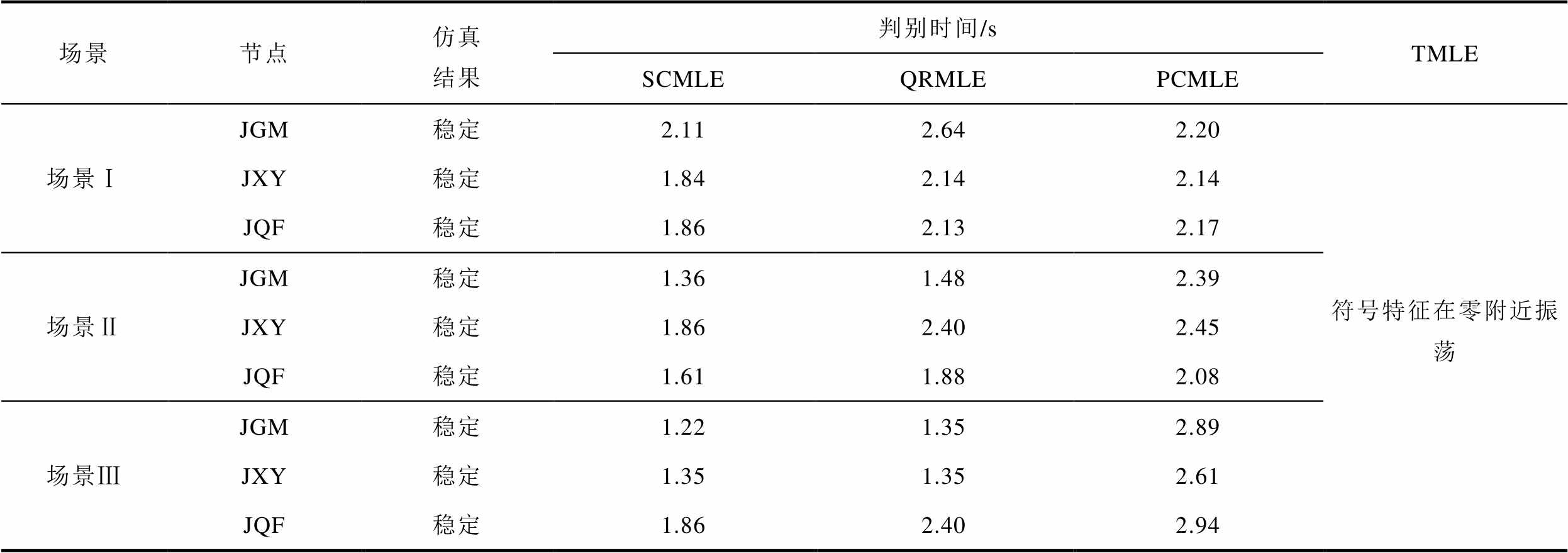 场景节点仿真结果判别时间/sTMLE SCMLEQRMLEPCMLE 场景ⅠJGM稳定2.112.642.20符号特征在零附近振荡 JXY稳定1.842.142.14 JQF稳定1.862.132.17 场景ⅡJGM稳定1.361.482.39 JXY稳定1.862.402.45 JQF稳定1.611.882.08 场景ⅢJGM稳定1.221.352.89 JXY稳定1.351.352.61 JQF稳定1.862.402.94