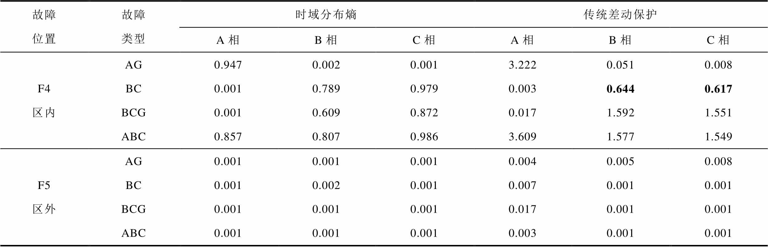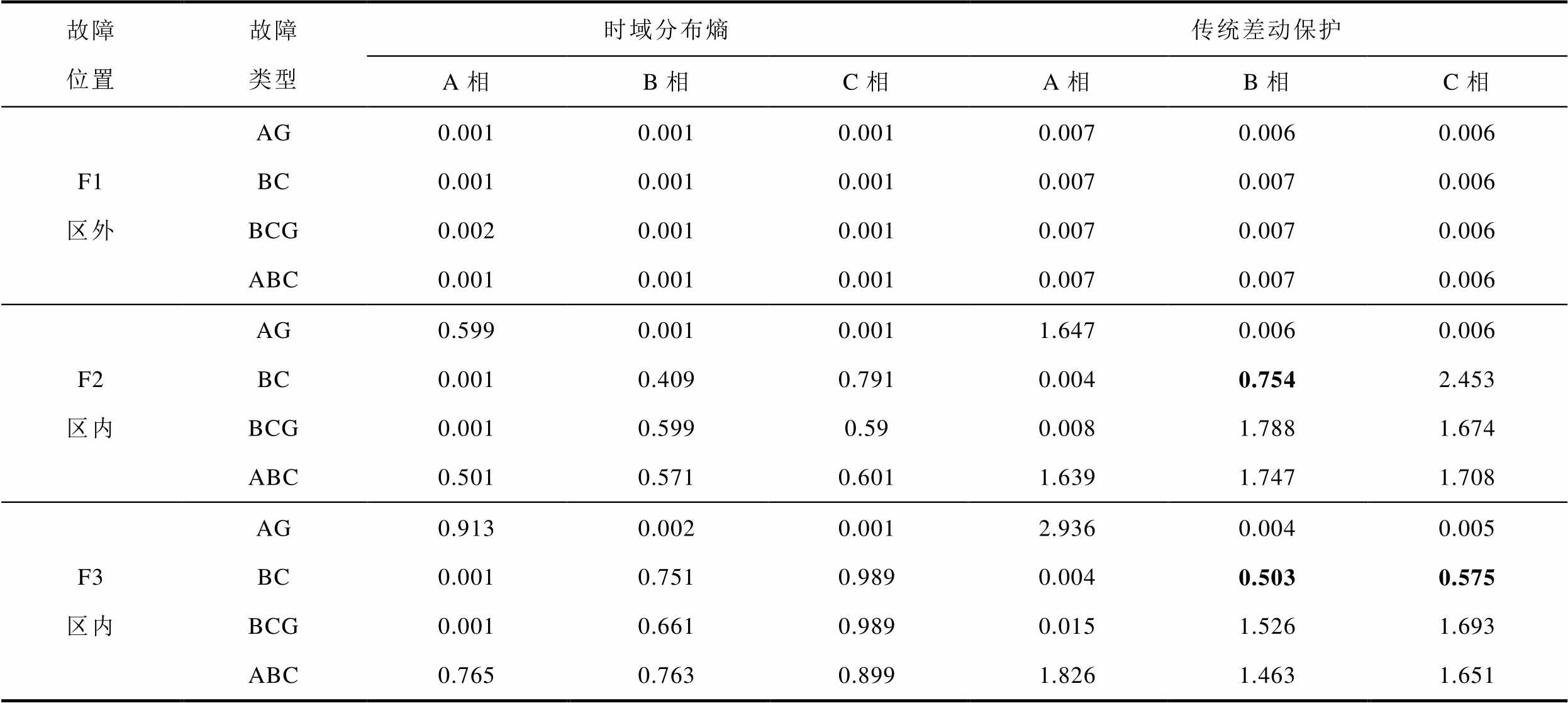 由表1可知,在区外发生不同类型故障时三相时域分布熵均小于整定值,保护不动作;而在区内故障时,非故障相时域分布熵小于整定值、故障相时域分布熵大于整定值,保护可靠动作。