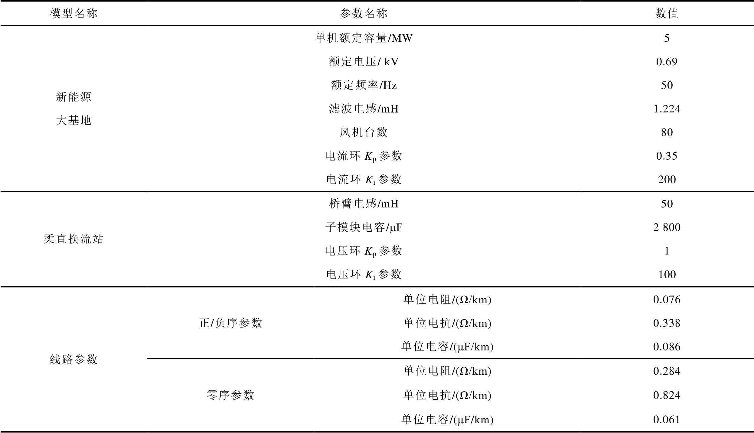 模型名称参数名称数值 新能源大基地单机额定容量/MW5 额定电压/ kV0.69 额定频率/Hz50 滤波电感/mH1.224 风机台数80 电流环Kp参数电流环Ki参数0.35200 柔直换流站桥臂电感/mH50 子模块电容/μF2 800 电压环Kp参数1 电压环Ki参数100 线路参数正/负序参数单位电阻/(Ω/km)0.076 单位电抗/(Ω/km)0.338 单位电容/(μF/km)0.086 零序参数单位电阻/(Ω/km)0.284 单位电抗/(Ω/km)0.824 单位电容/(μF/km)0.061
