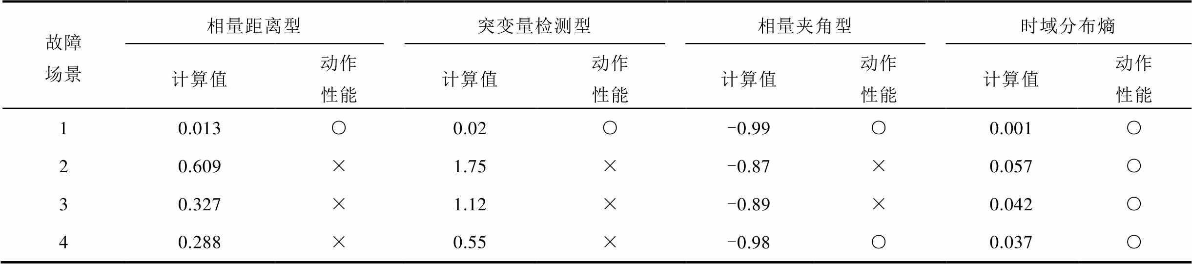 为了比较四种保护在出现异常值时是否会发生误动作,四种保护分别在图7所示的四种场景下,在不同类型异常值下保护性能见表2。