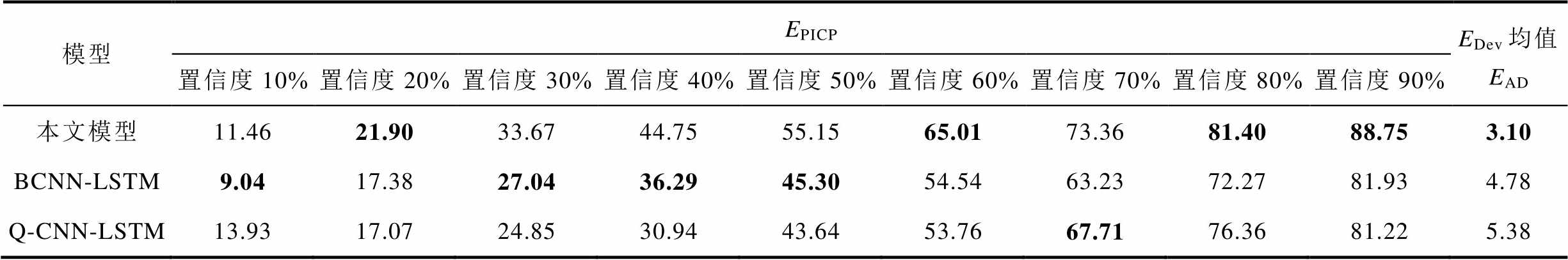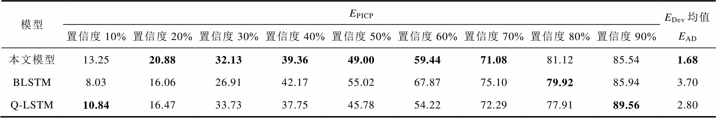 在预测区间可靠性方面,结合表2和图10a可以看出,尽管在10%与30%~50%置信度下BCNN-LSTM模型的预测区间覆盖率EPICP最接近理想值,但其对应置信度下的EPINRW锐度指标高于本文模型,说明该模型预测区间过宽,预测分布不集中。虽然在70%置信度下Q-CNN-LSTM模型的EPICP值最理想,但图10a中该模型曲线与理想曲线差距较大,预测效果并不好。在其余置信度下,本文模型生成的预测区间覆盖率EPICP都更接近理想值,同时EAD(3.10%)也远低于对比模型,可见本文所提模型能够生成具备有效覆盖率的预测区间。