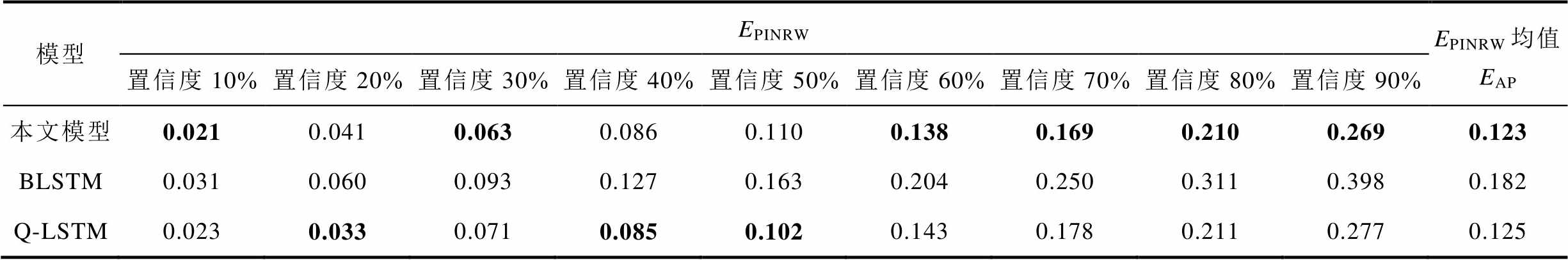 在预测区间锐度方面,由表3和图10b可以看出,本文模型生成EPINRW均值低于对比模型,并且在多数置信度下,本文模型的EPINRW曲线更接近横轴。表明本文模型预测结果生成的预测区间更加集中,预测效果更好。