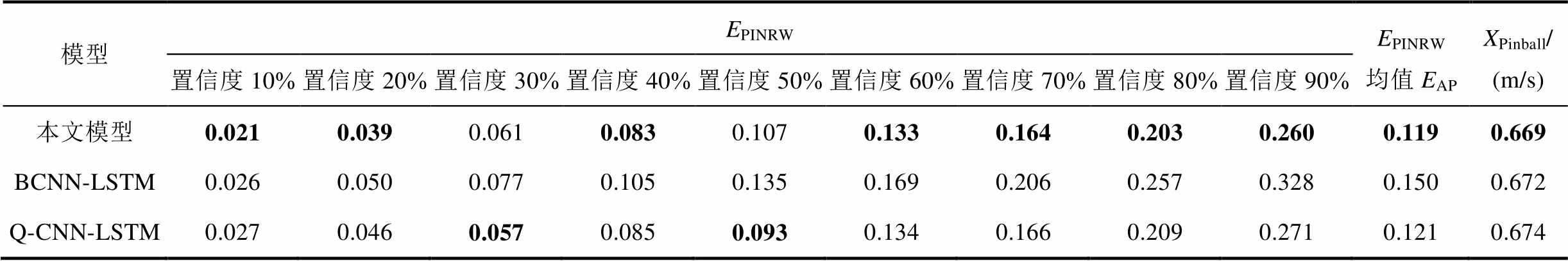 在预测区间Pinball分数方面,根据表3可以看出本文模型的XPinball值最低。与BCNN-LSTM和Q-CNN-LSTM模型相比,XPinball值分别下降了0.003 m/s与0.005 m/s。因此本文模型的概率预测质量最高。