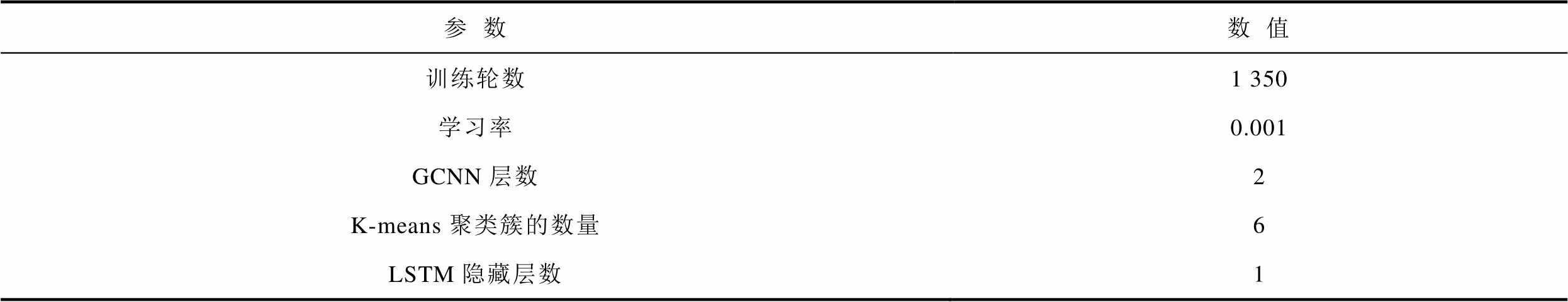 参数数值 训练轮数1 350 学习率0.001 GCNN层数2 K-means聚类簇的数量6 LSTM隐藏层数1