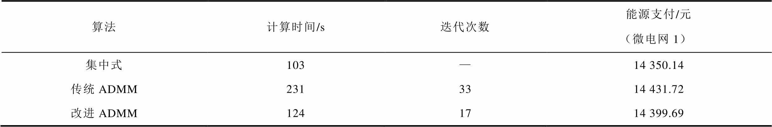 为验证本文改进ADMM算法的有效性,在本小节主要比较了集中式算法、传统ADMM算法和本文的改进ADMM算法性能。算法性能对比见表8。