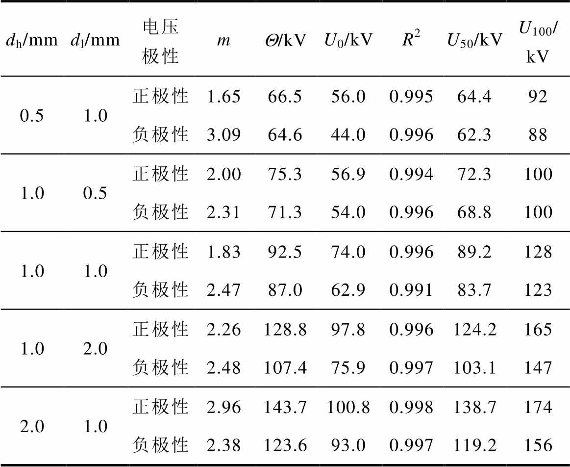 式中,F(U)为击穿电压的累积概率;U0为位置参数,即击穿概率为0%的临界击穿电压值;m为形状因子;Q 为尺度参数。