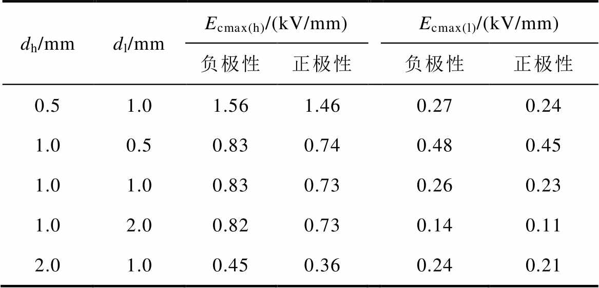 dh/mmdl/mmEcmax(h)/(kV/mm)Ecmax(l)/(kV/mm) 负极性正极性负极性正极性 0.51.01.561.460.270.24 1.00.50.830.740.480.45 1.01.00.830.730.260.23 1.02.00.820.730.140.11 2.01.00.450.360.240.21