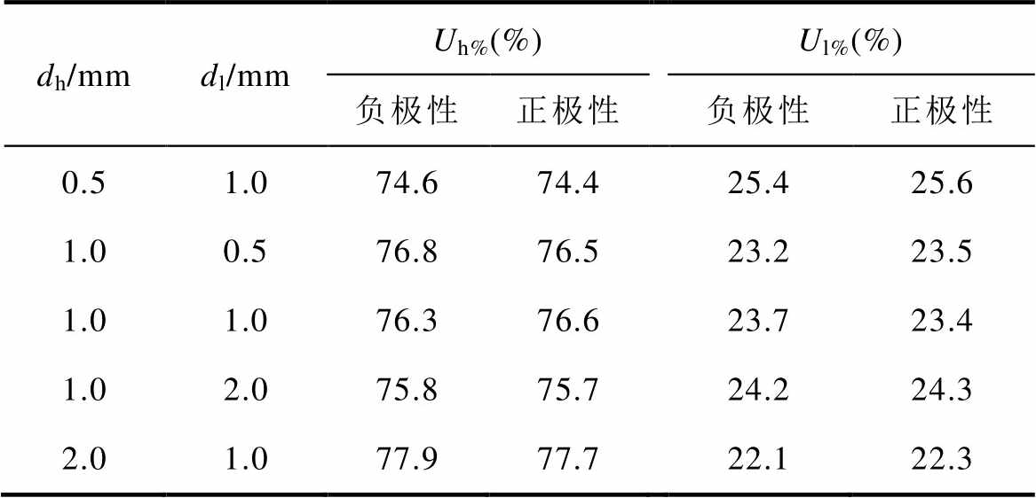 由表4可知,当dh固定为1.0 mm,dl从0.5 mm增加至2.0 mm时,正、负极性电压下Ecmax(l)显著降低70%以上,而Ecmax(h)几乎恒定为0.73 kV/mm与0.83 kV/mm;相似地,当dl固定为1.0 mm,dh从0.5 mm增加至2.0 mm时,正、负极性电压下Ecmax(h)的下降幅度同样超过70%,而Ecmax(l)略有降低。上述结果表明,两间隙的阴极最大电场强度主要取决于自身的间距,而另一间隙对其的影响较小。并且,由于球-板间隙电场分布的不对称性,正极性电压下的Ecmax(h)和Ecmax(l)分别要比负极性电压下平均低0.1 kV/mm和0.03 kV/mm。