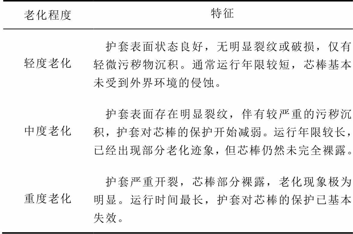 老化程度特征 轻度老化护套表面状态良好,无明显裂纹或破损,仅有轻微污秽物沉积。通常运行年限较短,芯棒基本未受到外界环境的侵蚀。 中度老化护套表面存在明显裂纹,伴有较严重的污秽沉积,护套对芯棒的保护开始减弱。运行年限较长,已经出现部分老化迹象,但芯棒仍然未完全裸露。 重度老化护套严重开裂,芯棒部分裸露,老化现象极为明显。运行时间最长,护套对芯棒的保护已基本失效。