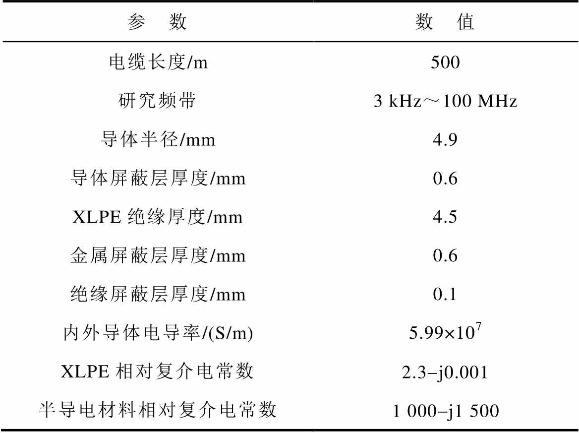 参 数数 值 电缆长度/m500 研究频带3 kHz~100 MHz 导体半径/mm4.9 导体屏蔽层厚度/mm0.6 XLPE绝缘厚度/mm4.5 金属屏蔽层厚度/mm0.6 绝缘屏蔽层厚度/mm0.1 内外导体电导率/(S/m)5.99×107 XLPE相对复介电常数2.3-j0.001 半导电材料相对复介电常数1 000-j1 500