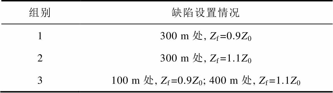 组别缺陷设置情况 1300 m处, Zf=0.9Z0 2300 m处, Zf=1.1Z0 3100 m处, Zf=0.9Z0; 400 m处, Zf=1.1Z0