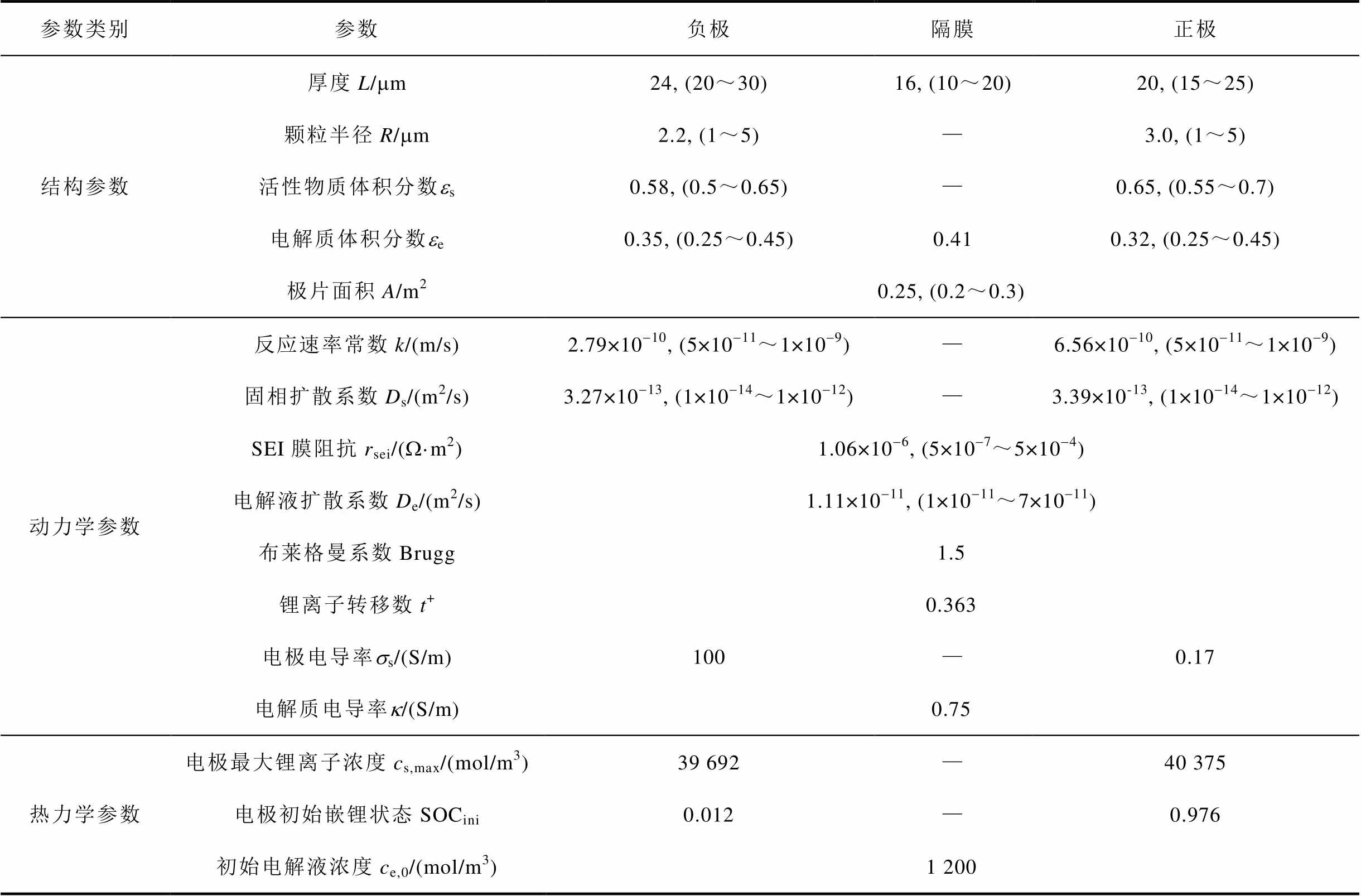 参数类别参数负极隔膜正极 结构参数厚度L/mm24, (20~30)16, (10~20)20, (15~25) 颗粒半径R/mm2.2, (1~5)—3.0, (1~5) 活性物质体积分数es0.58, (0.5~0.65)—0.65, (0.55~0.7) 电解质体积分数ee0.35, (0.25~0.45)0.410.32, (0.25~0.45) 极片面积A/m20.25, (0.2~0.3) 动力学参数反应速率常数k/(m/s)2.79×10-10, (5×10-11~1×10-9)—6.56×10-10, (5×10-11~1×10-9) 固相扩散系数Ds/(m2/s)3.27×10-13, (1×10-14~1×10-12)—3.39×10-13, (1×10-14~1×10-12) SEI膜阻抗rsei/(W·m2)1.06×10-6, (5×10-7~5×10-4) 电解液扩散系数De/(m2/s)1.11×10-11, (1×10-11~7×10-11) 布莱格曼系数Brugg1.5 锂离子转移数t+0.363 电极电导率ss/(S/m)100—0.17 电解质电导率k/(S/m)0.75 热力学参数电极最大锂离子浓度cs,max/(mol/m3)39 692—40 375 电极初始嵌锂状态SOCini0.012—0.976 初始电解液浓度ce,0/(mol/m3)1 200