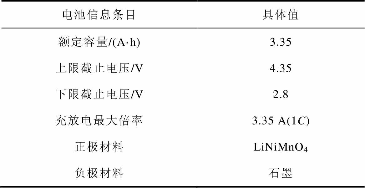 电池信息条目具体值 额定容量/(A·h)3.35 上限截止电压/V4.35 下限截止电压/V2.8 充放电最大倍率3.35 A(1C) 正极材料LiNiMnO4 负极材料石墨