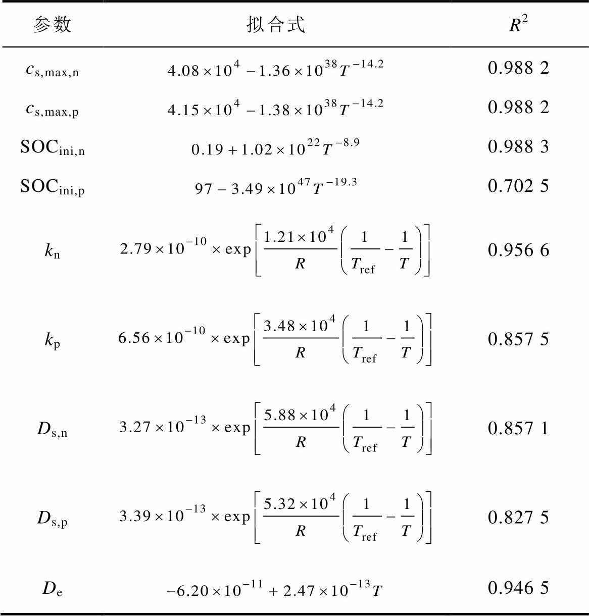参数拟合式R2 cs,max,n0.988 2 cs,max,p0.988 2 SOCini,n0.988 3 SOCini,p0.702 5 kn0.956 6 kp0.857 5 Ds,n0.857 1 Ds,p0.827 5 De0.946 5