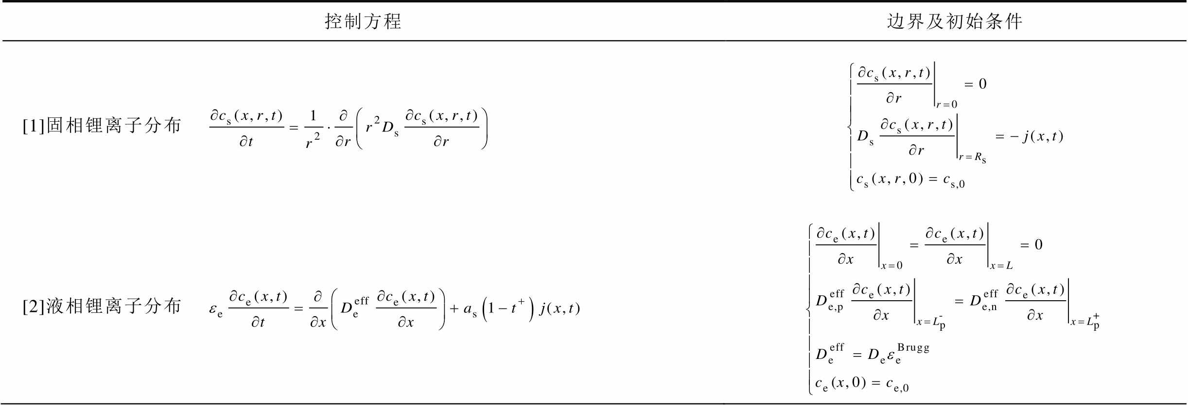 控制方程边界及初始条件 [1]固相锂离子分布 [2]液相锂离子分布