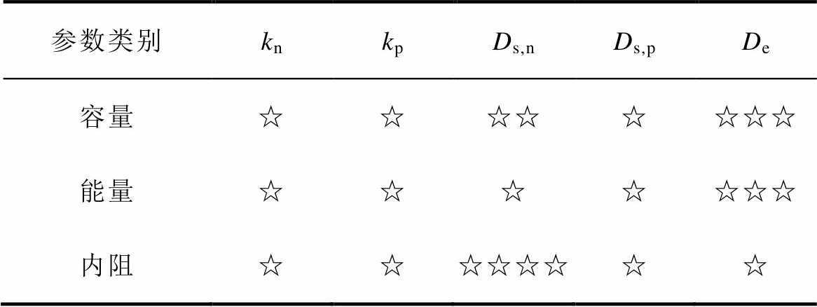 通过对比发现,尽管同一种自变量在不同充电倍率会引起电池电性能参数的改变,但具体到自变量自身的变化所带来的影响,不同的自变量参数则有不同的效果,不同倍率时电性能指标对动力学参数的依赖性见表5(“☆”符号的数量表征了不同倍率下电性能指标对电化学模型动力学参数的依赖性,表示电池电化学模型与外特性的联系程度,采用1~4个“☆”进行评估,“☆”越多依赖性越强)。反应速率常数的变化对电池可充入的容量和能量影响甚微。在较大倍率时,固相扩散系数Ds和液相扩散系数De的这类传输性质的自变量产生的效果较明显,代表了电池中的离子从高浓度区向低浓度区移动的速率,从而影响电荷的传输速率,最终造成容量指标发生波动。对于电池内阻而言,自变量的变化确实会造成内阻因变量的波动,但除负极扩散系数之外的波动范围普遍较小,说明负极扩散系数较大时离子在电极颗粒内部移动的阻力较弱,起始1 s时的直流内阻值自然会偏小,而10 s直流内阻因为接通电流的时间略长,极化效应开始积累,所以数值变化微弱。综上所述,可以将扩散类的参数与电池的容量和能量等电性能指标相关联,作为后续研究无钴电池健康状态分析的一个重要指标。而电荷反应类的参数则主要考虑其与电池温度及自身活化能的关系,视为电化学反应方程式的动力系数,直接使用温度拟合函数表达。