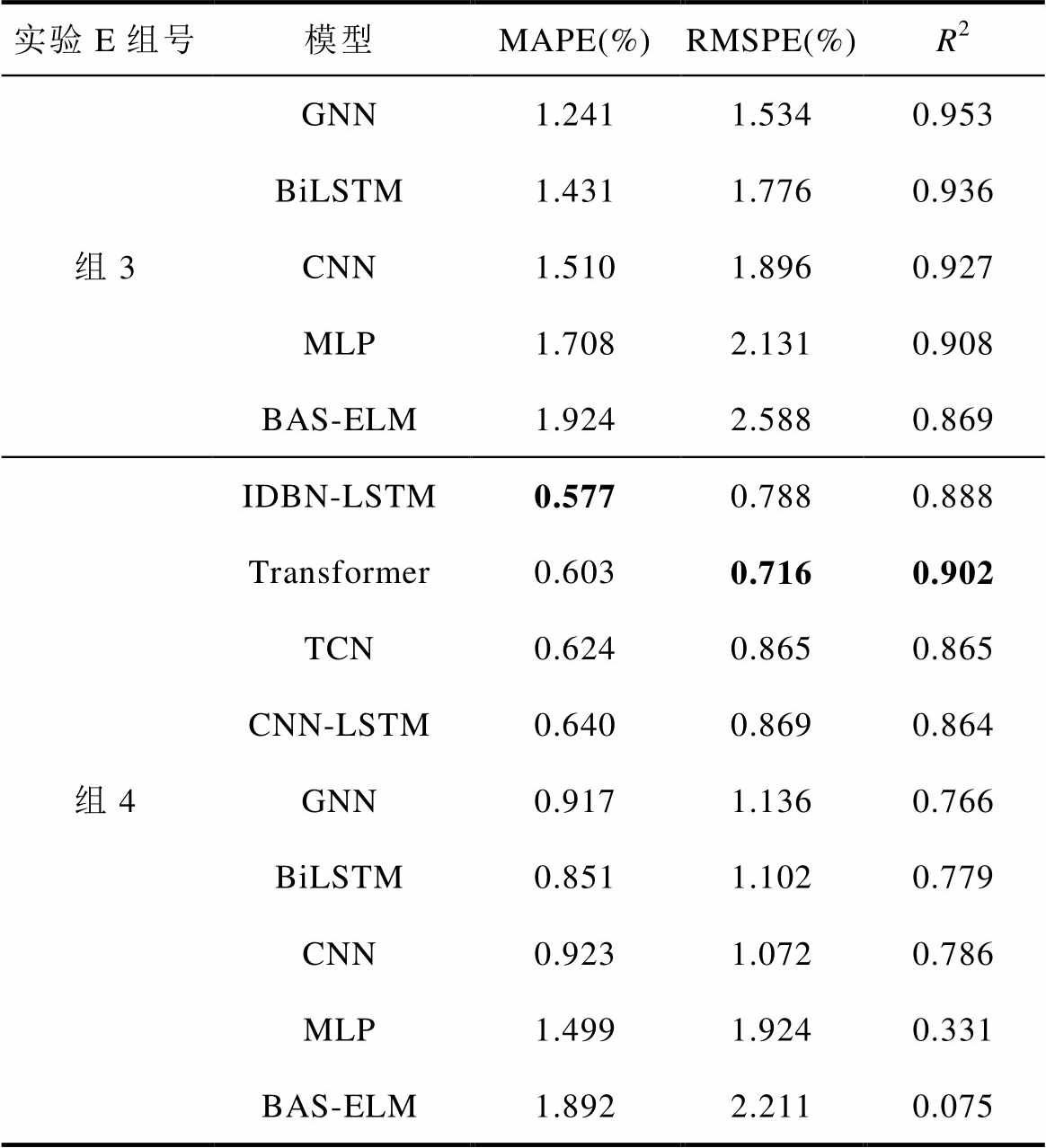 实验E组号模型MAPE(%)RMSPE(%)R2 组3GNN1.2411.5340.953 BiLSTM1.4311.7760.936 CNN1.5101.8960.927 MLP1.7082.1310.908 BAS-ELM1.9242.5880.869 组4IDBN-LSTM0.5770.7880.888 Transformer0.6030.7160.902 TCN0.6240.8650.865 CNN-LSTM0.6400.8690.864 GNN0.9171.1360.766 BiLSTM0.8511.1020.779 CNN0.9231.0720.786 MLP1.4991.9240.331 BAS-ELM1.8922.2110.075