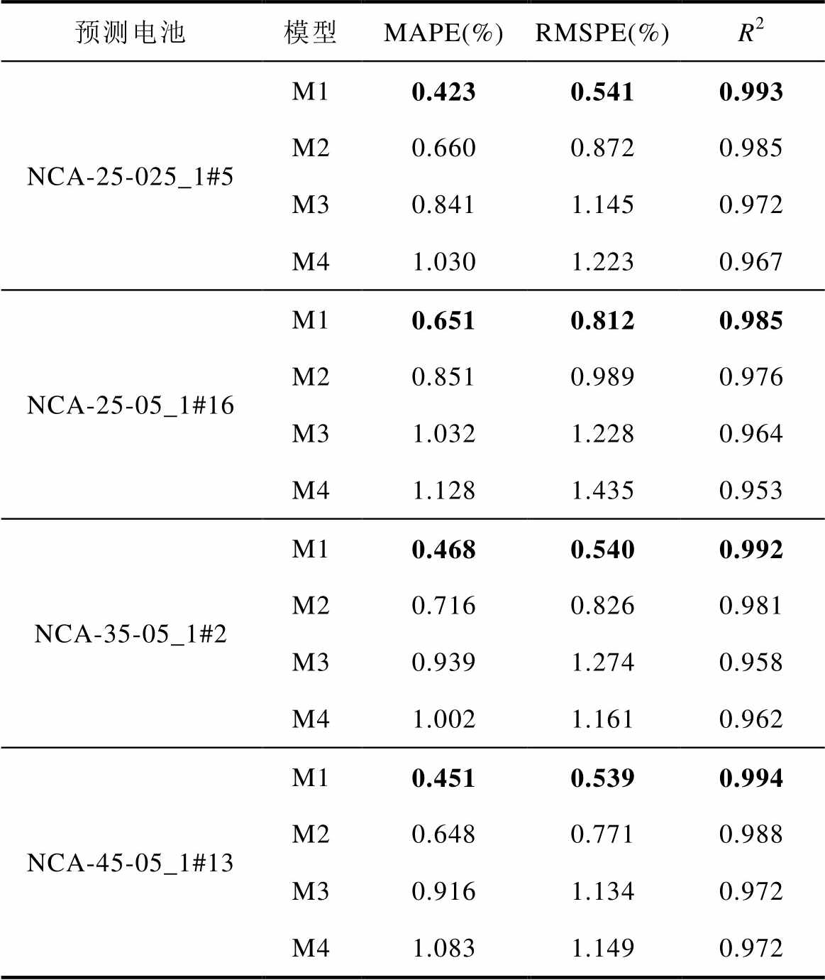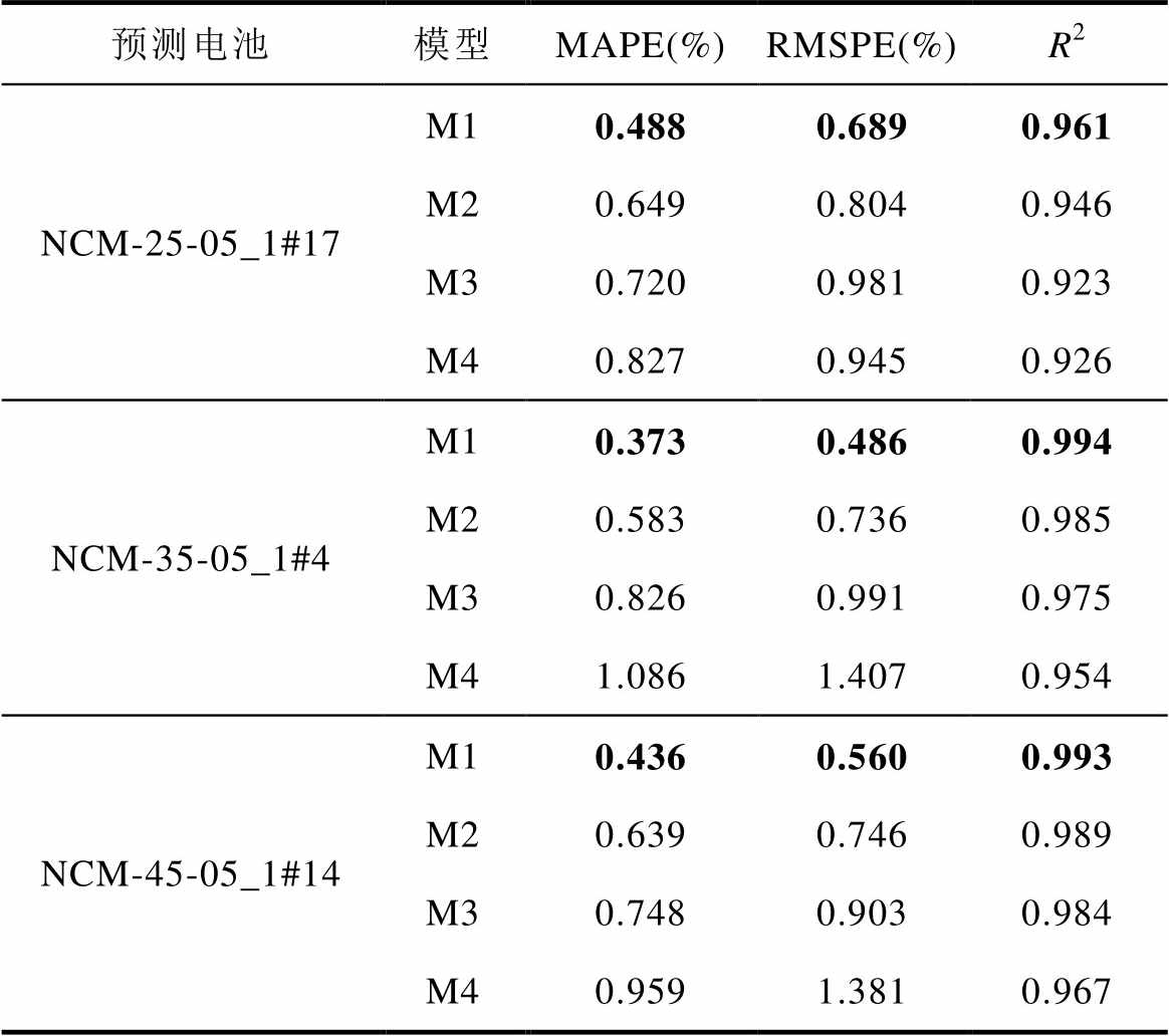 预测电池模型MAPE(%)RMSPE(%)R2 NCA-25-025_1#5M10.4230.5410.993 M20.6600.8720.985 M30.8411.1450.972 M41.0301.2230.967 NCA-25-05_1#16M10.6510.8120.985 M20.8510.9890.976 M31.0321.2280.964 M41.1281.4350.953 NCA-35-05_1#2M10.4680.5400.992 M20.7160.8260.981 M30.9391.2740.958 M41.0021.1610.962 NCA-45-05_1#13M10.4510.5390.994 M20.6480.7710.988 M30.9161.1340.972 M41.0831.1490.972