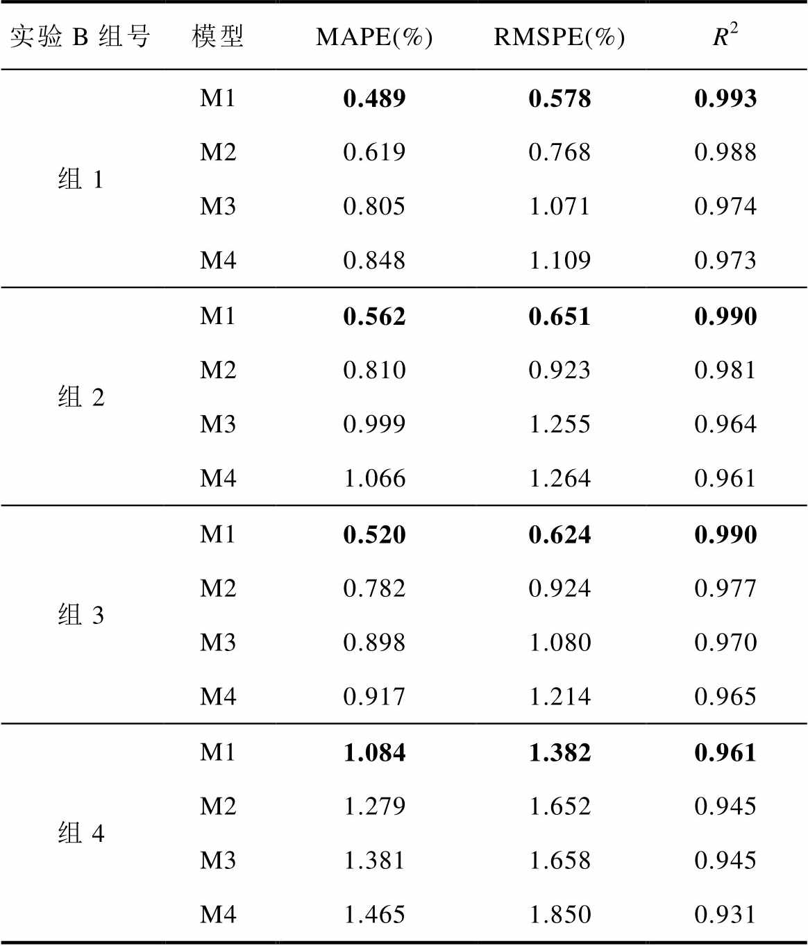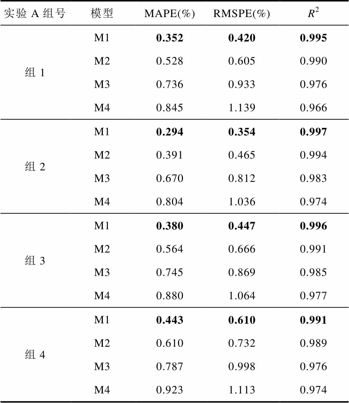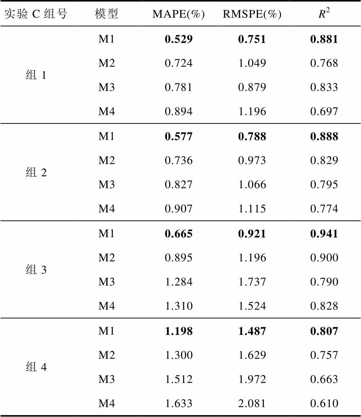 实验C组号模型MAPE(%)RMSPE(%)R2 组1M10.5290.7510.881 M20.7241.0490.768 M30.7810.8790.833 M40.8941.1960.697 组2M10.5770.7880.888 M20.7360.9730.829 M30.8271.0660.795 M40.9071.1150.774 组3M10.6650.9210.941 M20.8951.1960.900 M31.2841.7370.790 M41.3101.5240.828 组4M11.1981.4870.807 M21.3001.6290.757 M31.5121.9720.663 M41.6332.0810.610