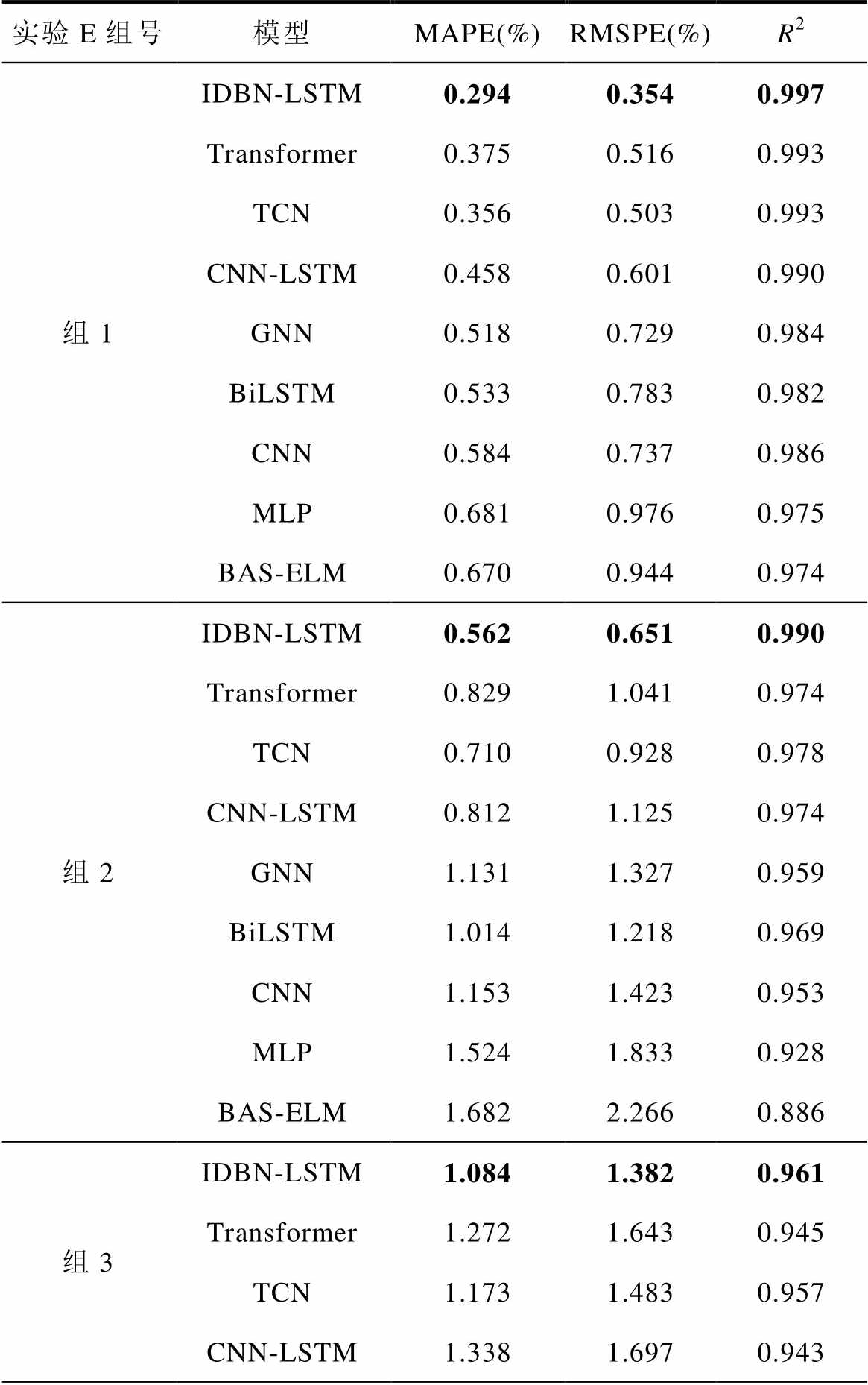 实验E组号模型MAPE(%)RMSPE(%)R2 组1IDBN-LSTM0.2940.3540.997 Transformer0.3750.5160.993 TCN0.3560.5030.993 CNN-LSTM0.4580.6010.990 GNN0.5180.7290.984 BiLSTM0.5330.7830.982 CNN0.5840.7370.986 MLP0.6810.9760.975 BAS-ELM0.6700.9440.974 组2IDBN-LSTM0.5620.6510.990 Transformer0.8291.0410.974 TCN0.7100.9280.978 CNN-LSTM0.8121.1250.974 GNN1.1311.3270.959 BiLSTM1.0141.2180.969 CNN1.1531.4230.953 MLP1.5241.8330.928 BAS-ELM1.6822.2660.886 组3IDBN-LSTM1.0841.3820.961 Transformer1.2721.6430.945 TCN1.1731.4830.957 CNN-LSTM1.3381.6970.943