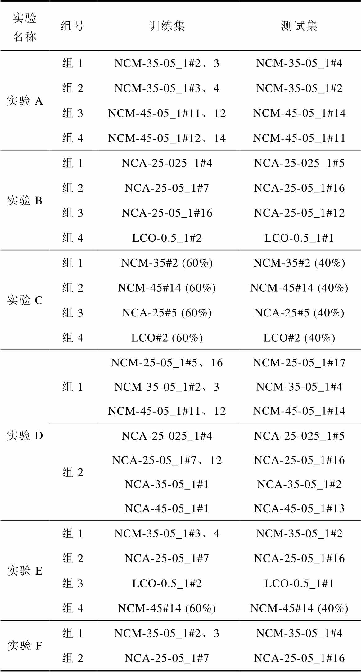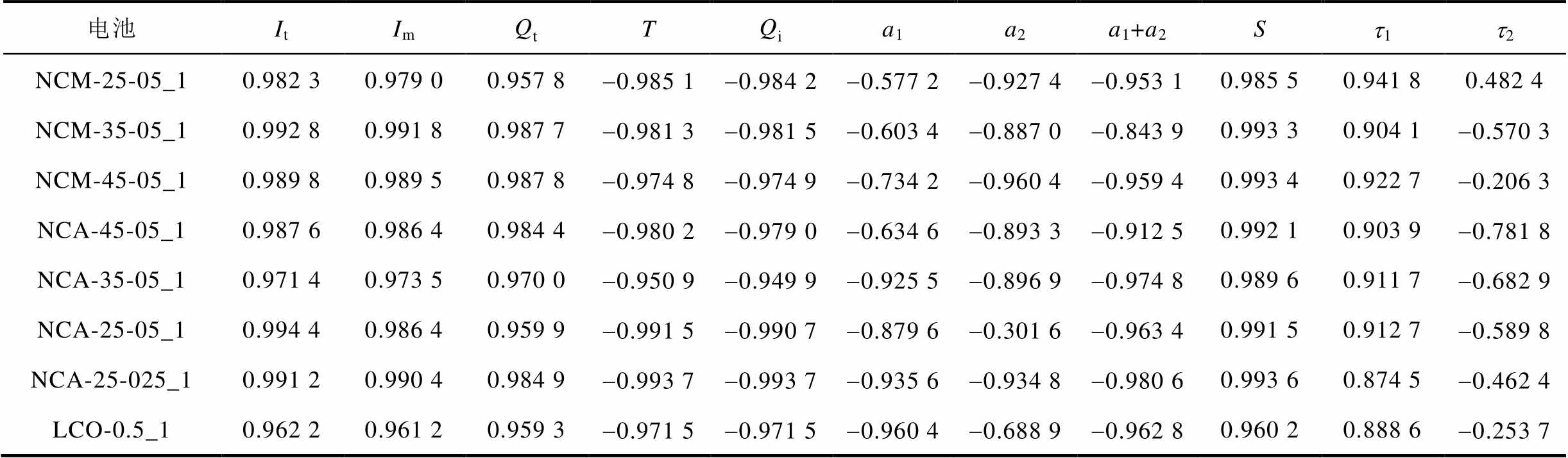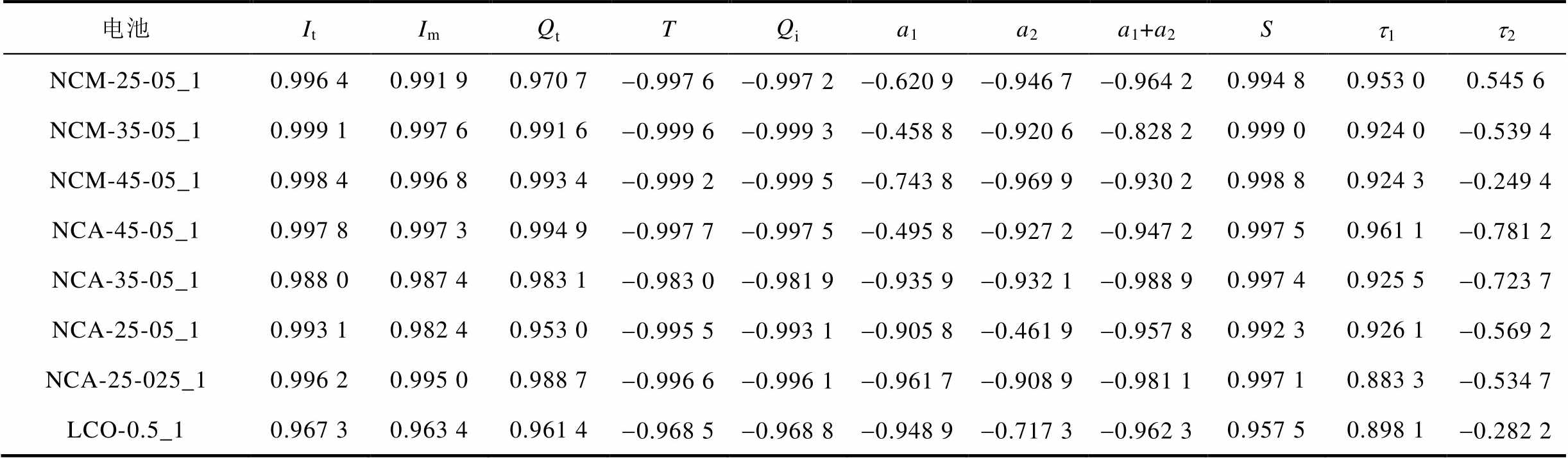 电池ItImQtTQia1a2a1+a2St1t2 NCM-25-05_10.982 30.979 00.957 8-0.985 1-0.984 2-0.577 2-0.927 4-0.953 10.985 50.941 80.482 4 NCM-35-05_10.992 80.991 80.987 7-0.981 3-0.981 5-0.603 4-0.887 0-0.843 90.993 30.904 1-0.570 3 NCM-45-05_10.989 80.989 50.987 8-0.974 8-0.974 9-0.734 2-0.960 4-0.959 40.993 40.922 7-0.206 3 NCA-45-05_10.987 60.986 40.984 4-0.980 2-0.979 0-0.634 6-0.893 3-0.912 50.992 10.903 9-0.781 8 NCA-35-05_10.971 40.973 50.970 0-0.950 9-0.949 9-0.925 5-0.896 9-0.974 80.989 60.911 7-0.682 9 NCA-25-05_10.994 40.986 40.959 9-0.991 5-0.990 7-0.879 6-0.301 6-0.963 40.991 50.912 7-0.589 8 NCA-25-025_10.991 20.990 40.984 9-0.993 7-0.993 7-0.935 6-0.934 8-0.980 60.993 60.874 5-0.462 4 LCO-0.5_10.962 20.961 20.959 3-0.971 5-0.971 5-0.960 4-0.688 9-0.962 80.960 20.888 6-0.253 7