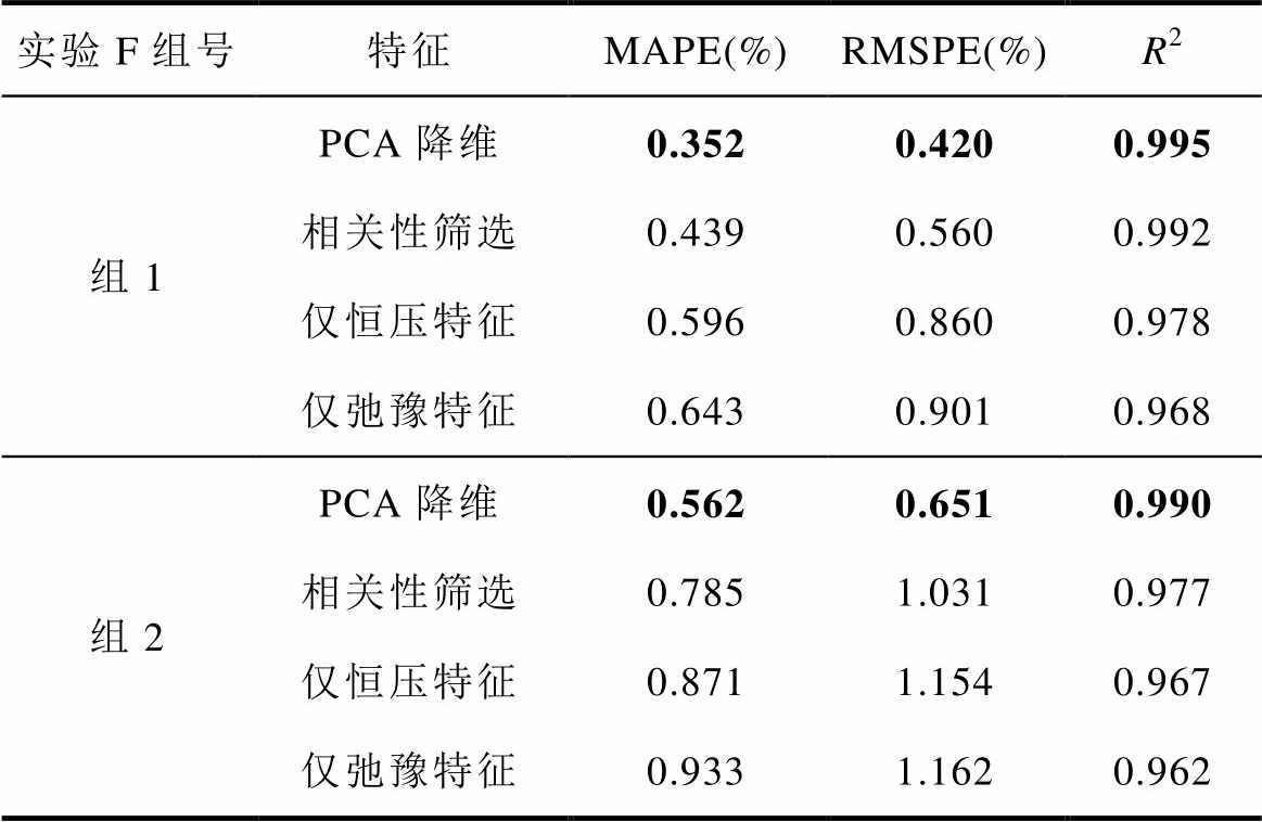 实验F组号特征MAPE(%)RMSPE(%)R2 组1PCA降维0.3520.4200.995 相关性筛选0.4390.5600.992 仅恒压特征0.5960.8600.978 仅弛豫特征0.6430.9010.968 组2PCA降维0.5620.6510.990 相关性筛选0.7851.0310.977 仅恒压特征0.8711.1540.967 仅弛豫特征0.9331.1620.962