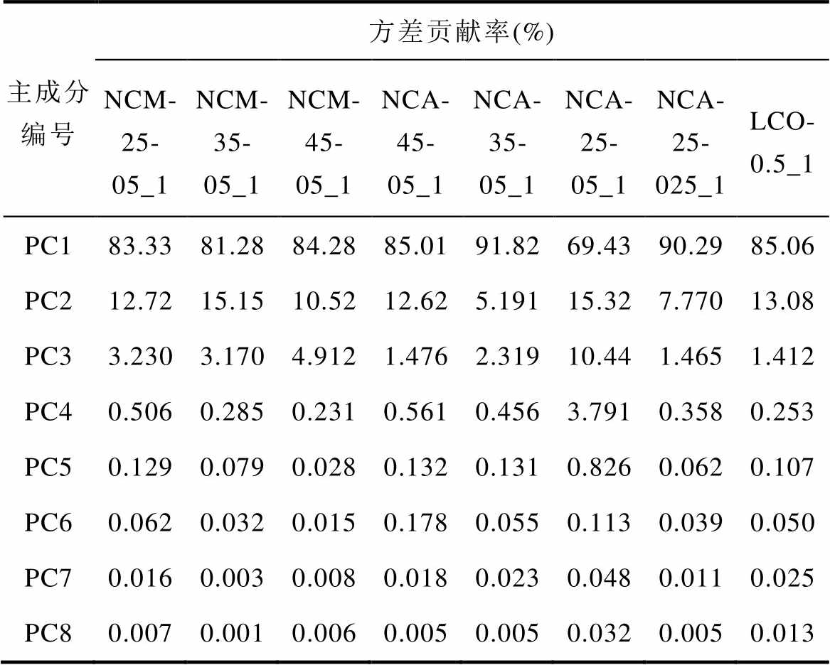 主成分编号方差贡献率(%) NCM-25-05_1NCM-35-05_1NCM-45-05_1NCA-45-05_1NCA-35-05_1NCA-25-05_1NCA-25-025_1LCO-0.5_1 PC183.3381.2884.2885.0191.8269.4390.2985.06 PC212.7215.1510.5212.625.19115.327.77013.08 PC33.2303.1704.9121.4762.31910.441.4651.412 PC40.5060.2850.2310.5610.4563.7910.3580.253 PC50.1290.0790.0280.1320.1310.8260.0620.107 PC60.0620.0320.0150.1780.0550.1130.0390.050 PC70.0160.0030.0080.0180.0230.0480.0110.025 PC80.0070.0010.0060.0050.0050.0320.0050.013