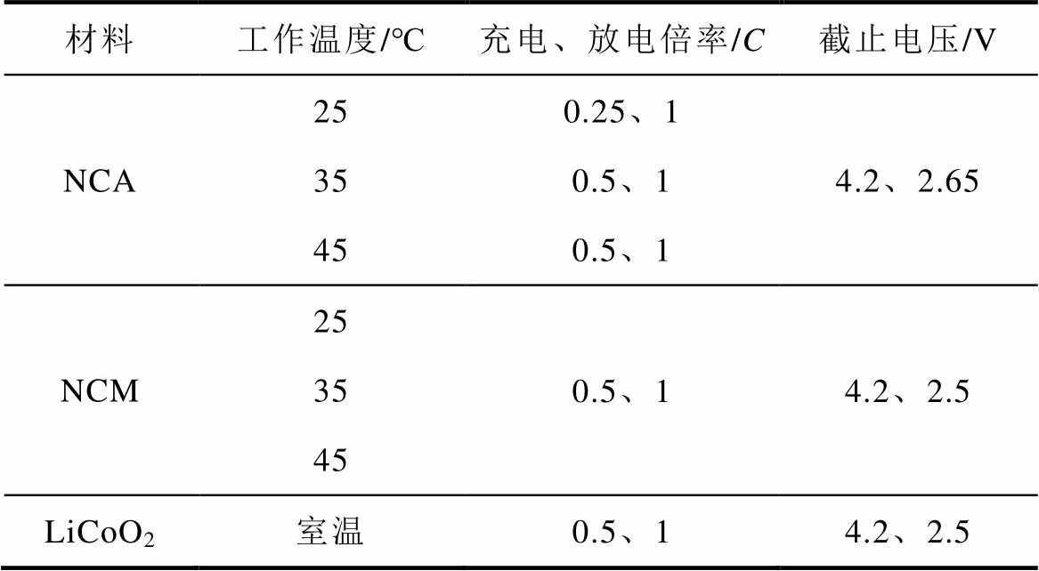 本文使用两个数据集的电池数据对所提出的方法进行有效性验证,其中数据集1来自同济大学清洁能源汽车工程中心[29],数据集2来自实验室自建老化数据集,两种数据集共包含三种材料、八种工况的电池数据。