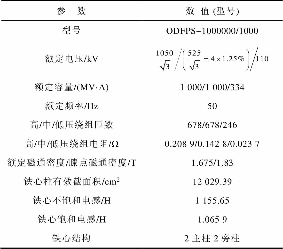 参 数数值 (型号) 型号ODFPS-1000000/1000 额定电压/kV 额定容量/(MV·A)1 000/1 000/334 额定频率/Hz50 高/中/低压绕组匝数678/678/246 高/中/低压绕组电阻/W0.208 9/0.142 8/0.023 7 额定磁通密度/膝点磁通密度/T1.675/1.83 铁心柱有效截面积/cm212 029.39 铁心不饱和电感/H1 155.65 铁心饱和电感/H1.065 9 铁心结构2主柱2旁柱