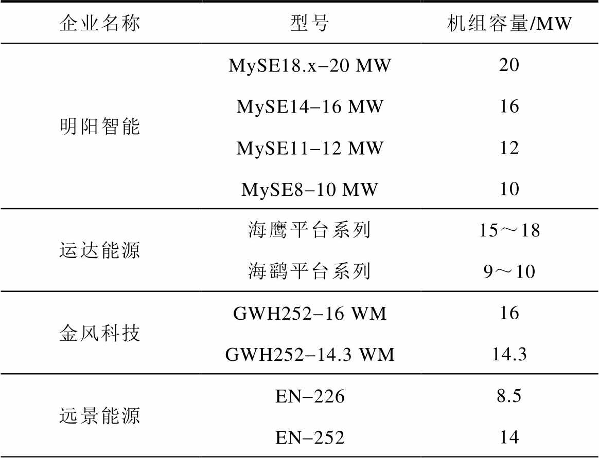 企业名称型号机组容量/MW 明阳智能MySE18.x-20 MW20 MySE14-16 MW16 MySE11-12 MW12 MySE8-10 MW10 运达能源海鹰平台系列15~18 海鹞平台系列9~10 金风科技GWH252-16 WM16 GWH252-14.3 WM14.3 远景能源EN-2268.5 EN-25214