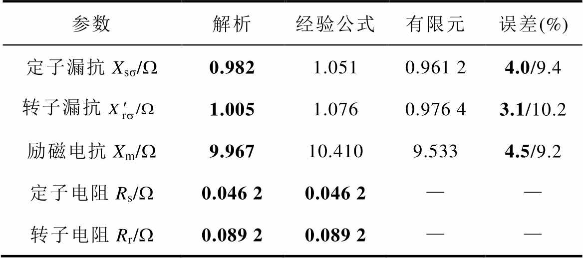 参数解析经验公式有限元误差(%) 定子漏抗Xsσ/W0.9821.0510.961 24.0/9.4 转子漏抗1.0051.0760.976 43.1/10.2 励磁电抗Xm/W9.96710.4109.5334.5/9.2 定子电阻Rs/W0.046 20.046 2—— 转子电阻Rr/W0.089 20.089 2——