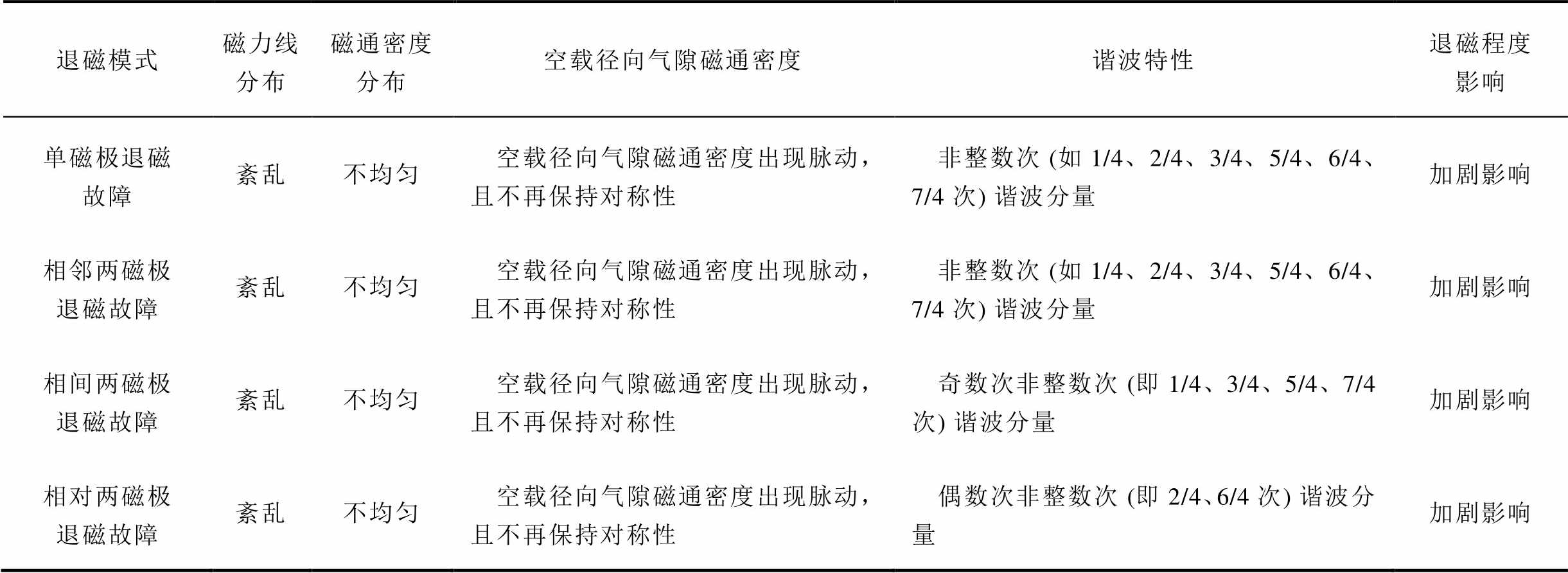 非均匀退磁是指永磁同步电机的单个或者多个磁极发生退磁故障,且退磁程度不尽相同。相较于均匀退磁故障,非均匀退磁故障模式更加繁杂,且发生概率远高于均匀退磁,因此更需重点关注。为有效分析非均匀退磁故障对永磁同步电机性能的影响,选择四种代表性退磁模式进行模拟分析,见表2。此外,为避免赘述,本文以单磁极退磁故障为例进行分析。