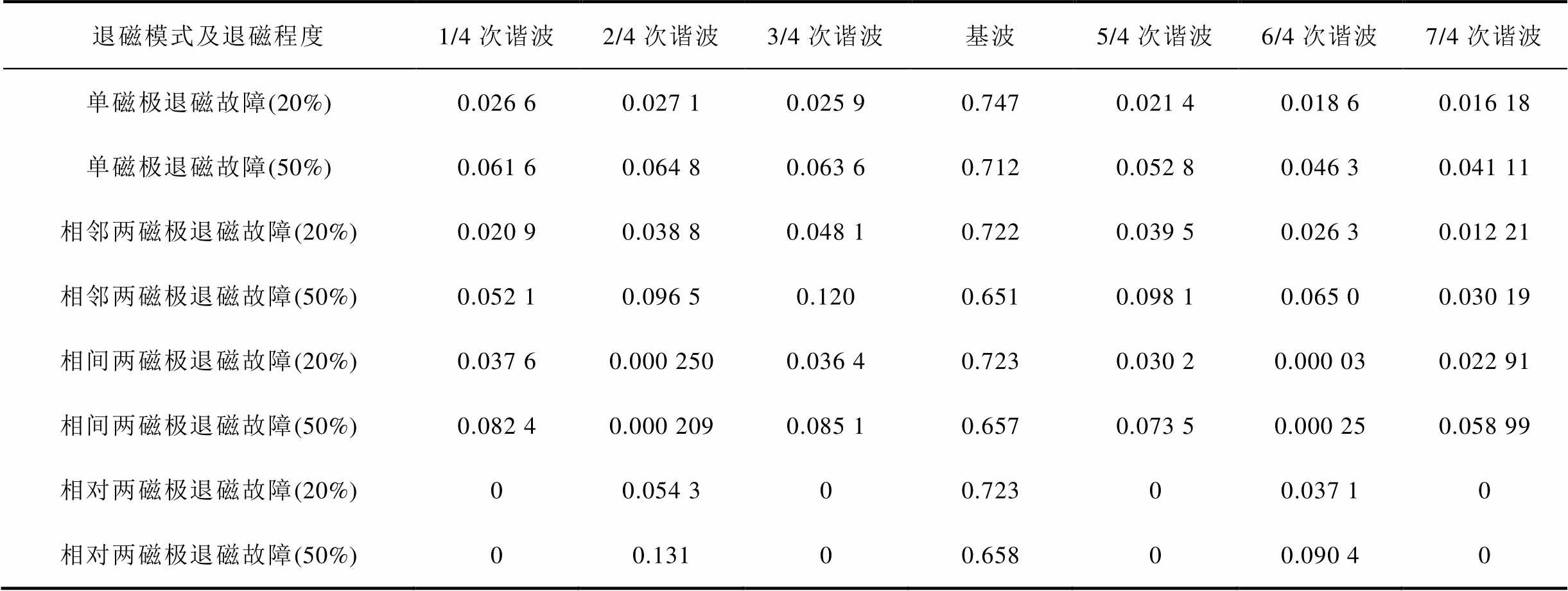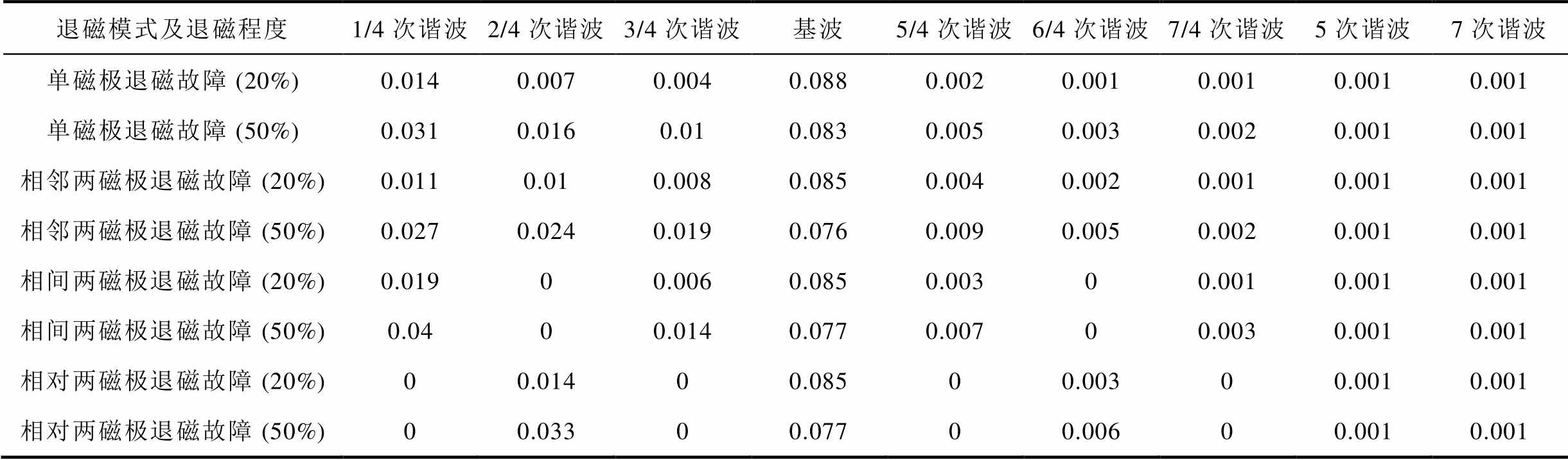 退磁模式及退磁程度1/4次谐波2/4次谐波3/4次谐波基波5/4次谐波6/4次谐波7/4次谐波5次谐波7次谐波 单磁极退磁故障 (20%)0.0140.0070.0040.0880.0020.0010.0010.0010.001 单磁极退磁故障 (50%)0.0310.0160.010.0830.0050.0030.0020.0010.001 相邻两磁极退磁故障 (20%)0.0110.010.0080.0850.0040.0020.0010.0010.001 相邻两磁极退磁故障 (50%)0.0270.0240.0190.0760.0090.0050.0020.0010.001 相间两磁极退磁故障 (20%)0.01900.0060.0850.00300.0010.0010.001 相间两磁极退磁故障 (50%)0.0400.0140.0770.00700.0030.0010.001 相对两磁极退磁故障 (20%)00.01400.08500.00300.0010.001 相对两磁极退磁故障 (50%)00.03300.07700.00600.0010.001