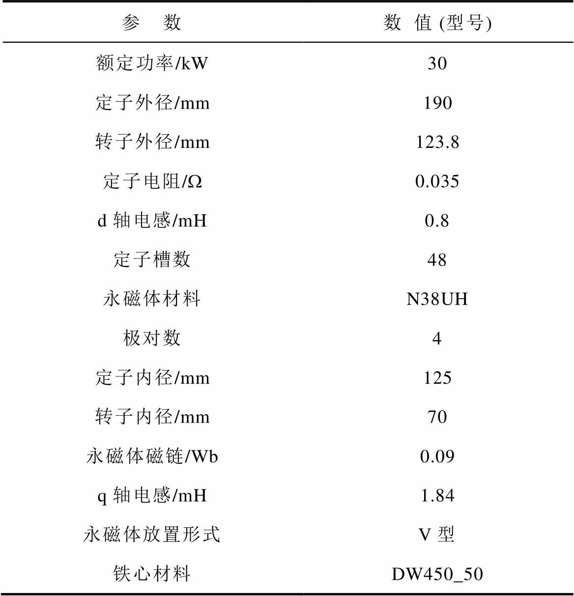 参 数数值 (型号) 额定功率/kW30 定子外径/mm190 转子外径/mm123.8 定子电阻/W0.035 d轴电感/mH0.8 定子槽数48 永磁体材料N38UH 极对数4 定子内径/mm125 转子内径/mm70 永磁体磁链/Wb0.09 q轴电感/mH1.84 永磁体放置形式V型 铁心材料DW450_50