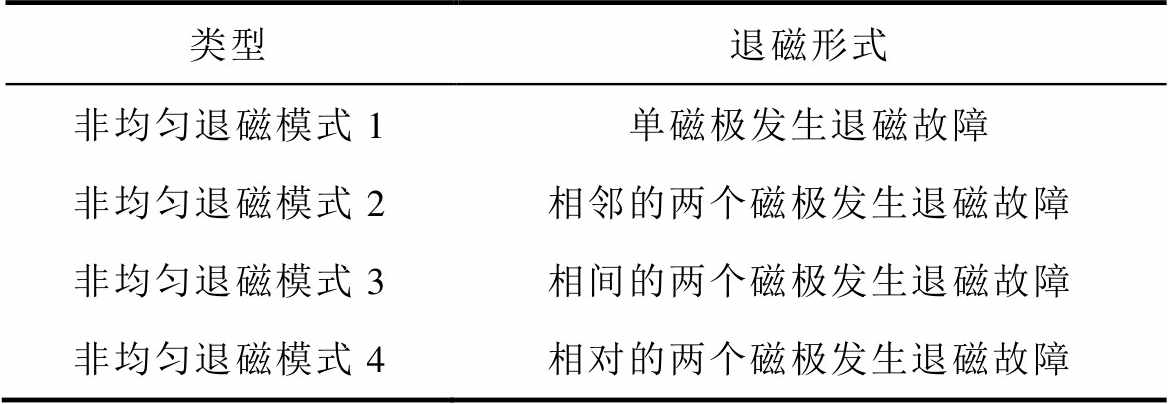 类型退磁形式 非均匀退磁模式1单磁极发生退磁故障 非均匀退磁模式2相邻的两个磁极发生退磁故障 非均匀退磁模式3相间的两个磁极发生退磁故障 非均匀退磁模式4相对的两个磁极发生退磁故障
