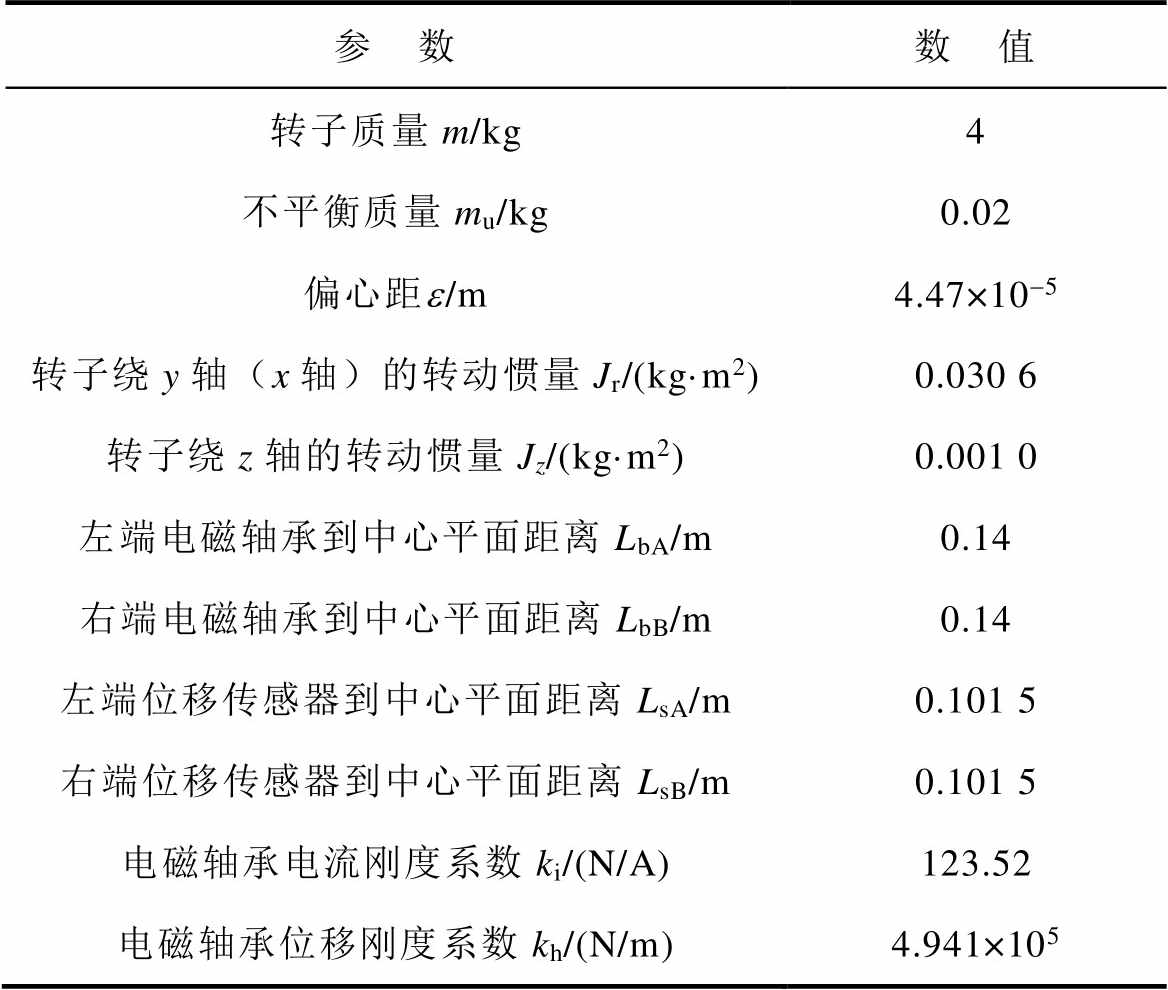 参 数数 值 转子质量m/kg4 不平衡质量mu/kg0.02 偏心距e/m4.47×10-5 转子绕y轴(x轴)的转动惯量Jr/(kg·m2)0.030 6 转子绕z轴的转动惯量Jz/(kg·m2)0.001 0 左端电磁轴承到中心平面距离LbA/m0.14 右端电磁轴承到中心平面距离LbB/m0.14 左端位移传感器到中心平面距离LsA/m0.101 5 右端位移传感器到中心平面距离LsB/m0.101 5 电磁轴承电流刚度系数ki/(N/A)123.52 电磁轴承位移刚度系数kh/(N/m)4.941×105