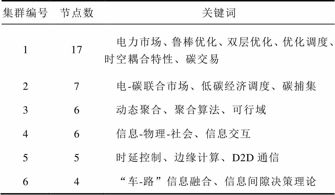 集群编号节点数关键词 117电力市场、鲁棒优化、双层优化、优化调度、时空耦合特性、碳交易 27电-碳联合市场、低碳经济调度、碳捕集 36动态聚合、聚合算法、可行域 46信息-物理-社会、信息交互 55时延控制、边缘计算、D2D通信 64“车-路”信息融合、信息间隙决策理论