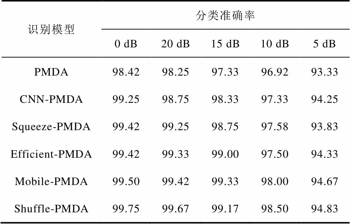 识别模型分类准确率 0 dB20 dB15 dB10 dB5 dB PMDA98.4298.2597.3396.9293.33 CNN-PMDA99.2598.7598.3397.3394.25 Squeeze-PMDA99.4299.2598.7597.5893.83 Efficient-PMDA99.4299.3399.0097.5094.33 Mobile-PMDA99.5099.4299.3398.0094.67 Shuffle-PMDA99.7599.6799.1798.5094.83
