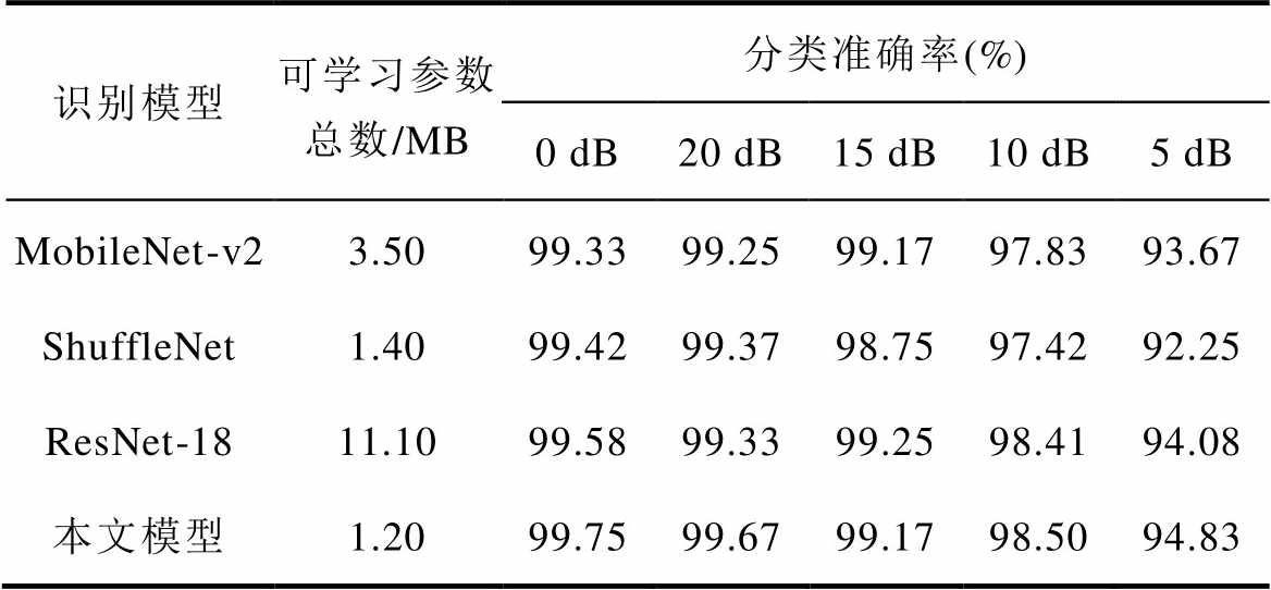 识别模型可学习参数总数/MB分类准确率(%) 0 dB20 dB15 dB10 dB5 dB MobileNet-v23.5099.3399.2599.1797.8393.67 ShuffleNet1.4099.4299.3798.7597.4292.25 ResNet-1811.1099.5899.3399.2598.4194.08 本文模型1.2099.7599.6799.1798.5094.83