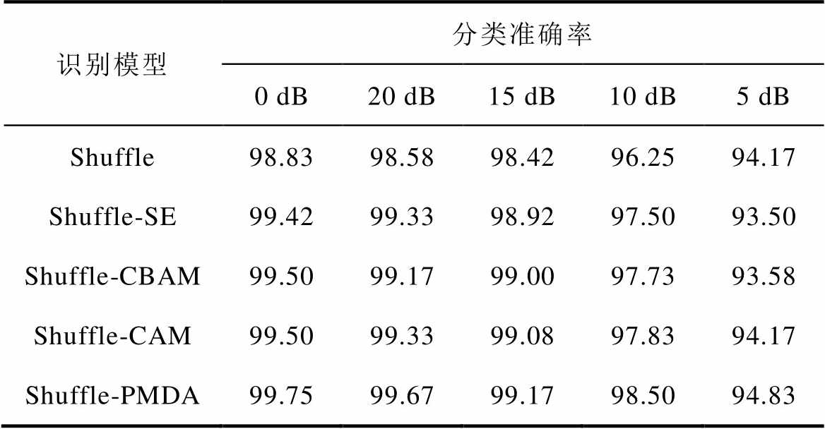 识别模型分类准确率 0 dB20 dB15 dB10 dB5 dB Shuffle98.8398.5898.4296.2594.17 Shuffle-SE99.4299.3398.9297.5093.50 Shuffle-CBAM99.5099.1799.0097.7393.58 Shuffle-CAM99.5099.3399.0897.8394.17 Shuffle-PMDA99.7599.6799.1798.5094.83