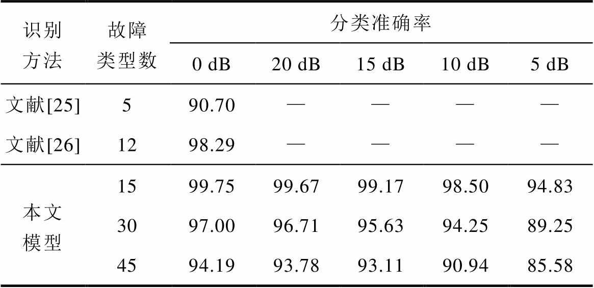 针对本文实验所用的数据集,表10展示了不同文献方法与本文方法的对比结果。文献[25]提出了一种基于信息增益的特征选择方法,并建立了梯度提升机器学习模型,成功地区分了匝间短路情况下的四种故障程度及正常状态下的五种故障类型。在无噪声环境下,该方法的识别准确率为90.70%,但其故障类型的选择较为有限,且未进行抗噪性验证。文献[26]则提出了一种基于融合权值更新的离散小波变换卷积神经网络(Discrete Wavelet Transform-Convolutional Neural Network, DWT-CNN)与长短期记忆(Long Short-Term Memory, LSTM)相结合的异常检测方法,既考虑了绕组间短路,也涵盖了匝间短路,共计12种故障类型。在无噪声环境下,该方法的识别准确率为98.29%,较文献[25]提高了7.59%,然而同样未进行抗噪性验证,对模型的适应性和泛化能力缺乏验证。相比之下,本文方法在包括绕组间短路和匝间短路的15种故障类型下,表现出了更高的识别准确率。在无噪声环境中,本文方法的识别准确率达到了99.75%,较文献[25]提高了9.05%,较文献[26]提高了1.46%。此外,本文还针对不同噪声环境下包含更多故障类型的数据集的抗噪性进行了验证。在信噪比为5 dB的高噪声环境和信噪比为20 dB的低噪声环境中,包含15种故障类型的数据集识别准确率分别为94.83%和99.67%;包含30种故障类型的数据集识别准确率分别为89.25%和96.71%;而包含45种故障类型的数据集识别准确率分别为85.58%和93.78%,这些对比结果充分证明了本文方法相较于其他文献方法在故障类型全面性及抗噪性方面的优越性。