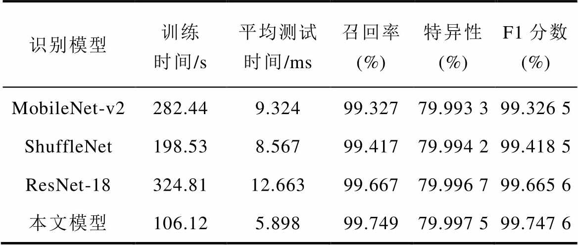 识别模型训练时间/s平均测试时间/ms召回率(%)特异性(%)F1分数(%) MobileNet-v2282.449.32499.32779.993 399.326 5 ShuffleNet198.538.56799.41779.994 299.418 5 ResNet-18324.8112.66399.66779.996 799.665 6 本文模型106.125.89899.74979.997 599.747 6