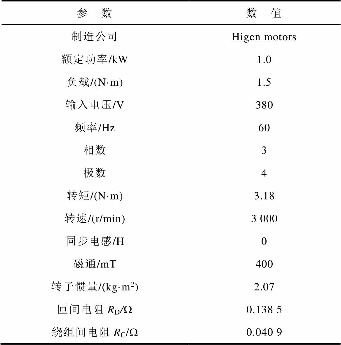 参 数数 值 制造公司Higen motors 额定功率/kW1.0 负载/(N·m)1.5 输入电压/V380 频率/Hz60 相数3 极数4 转矩/(N·m)3.18 转速/(r/min)3 000 同步电感/H0 磁通/mT400 转子惯量/(kg·m2)2.07 匝间电阻RD/W0.138 5 绕组间电阻RC/W0.040 9