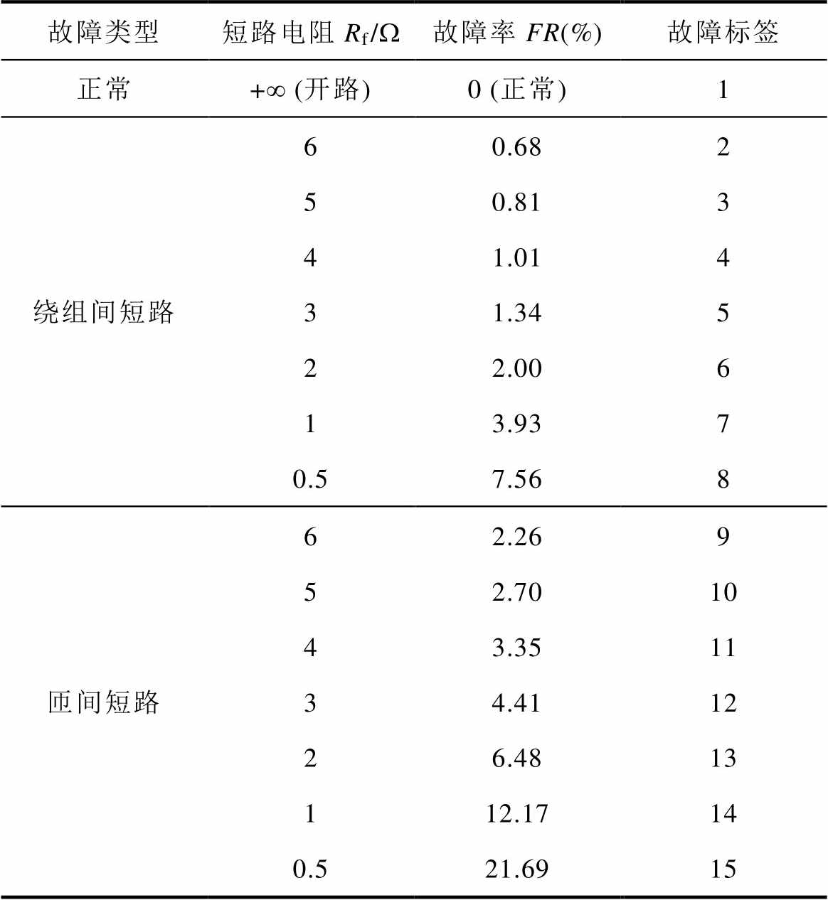 故障类型短路电阻Rf/W故障率FR(%)故障标签 正常+∞ (开路)0 (正常)1 绕组间短路60.682 50.813 41.014 31.345 22.006 13.937 0.57.568 匝间短路62.269 52.7010 43.3511 34.4112 26.4813 112.1714 0.521.6915