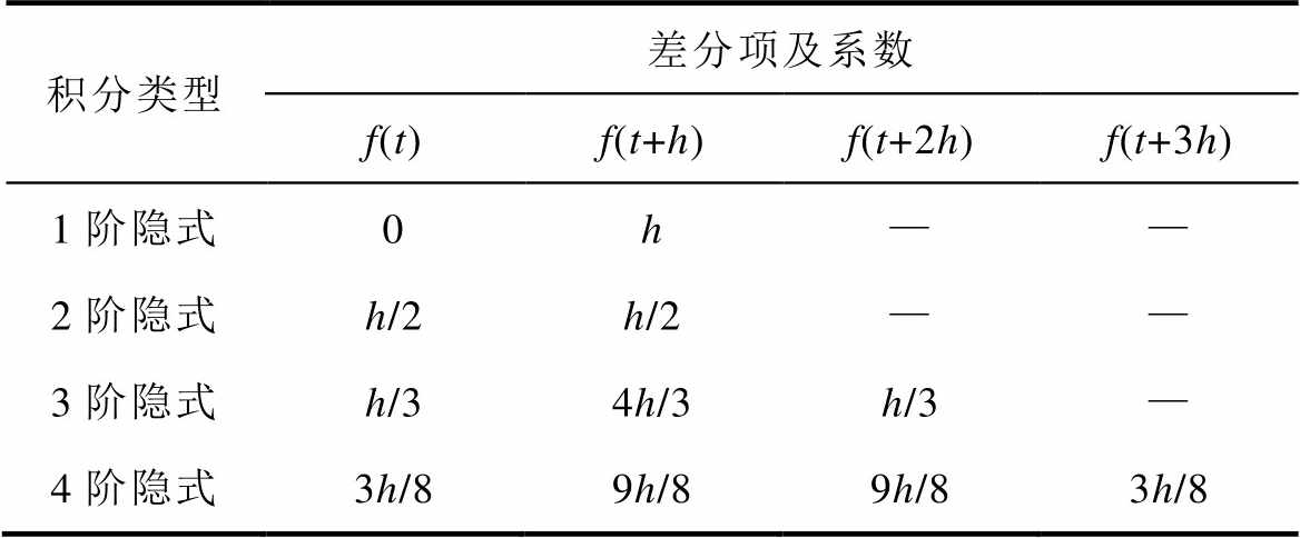 积分类型差分项及系数 f(t)f(t+h)f(t+2h)f(t+3h) 1阶隐式0h—— 2阶隐式h/2h/2—— 3阶隐式h/34h/3h/3— 4阶隐式3h/89h/89h/83h/8