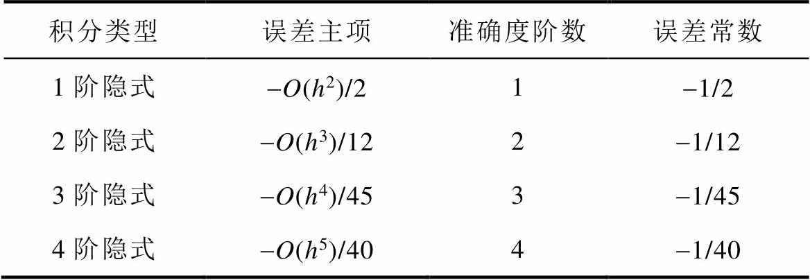 积分类型误差主项准确度阶数误差常数 1阶隐式-O(h2)/21-1/2 2阶隐式-O(h3)/122-1/12 3阶隐式-O(h4)/453-1/45 4阶隐式-O(h5)/404-1/40