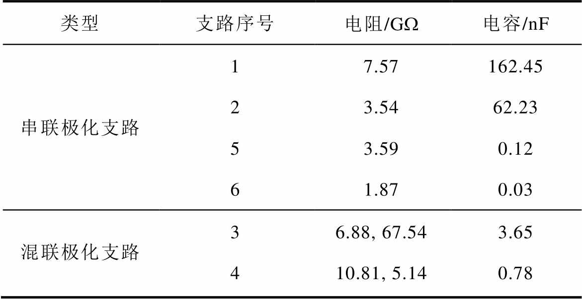 类型支路序号电阻/GW电容/nF 串联极化支路17.57162.45 23.5462.23 53.590.12 61.870.03 混联极化支路36.88, 67.543.65 410.81, 5.140.78