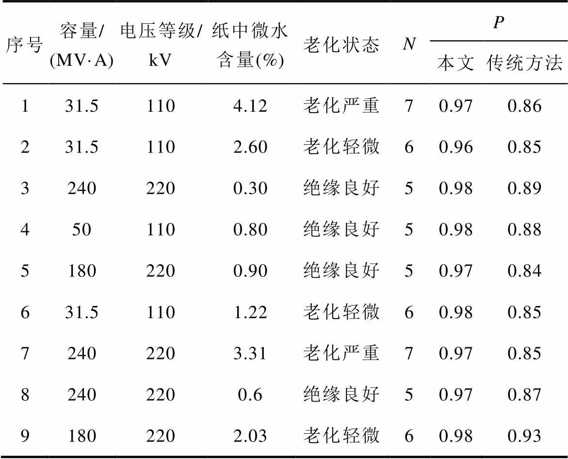 序号容量/(MV·A)电压等级/kV纸中微水含量(%)老化状态NP 本文传统方法 131.51104.12老化严重70.970.86 231.51102.60老化轻微60.960.85 32402200.30绝缘良好50.980.89 4501100.80绝缘良好50.980.88 51802200.90绝缘良好50.970.84 631.51101.22老化轻微60.980.85 72402203.31老化严重70.970.85 82402200.6绝缘良好50.970.87 91802202.03老化轻微60.980.93